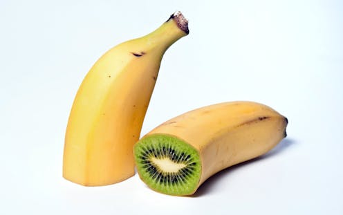 Falso. Para conseguir una foto semejante, solo hace falta habilidad para vaciar un trozo de pulpa de plátano y sustituirla por pulpa de kiwi.